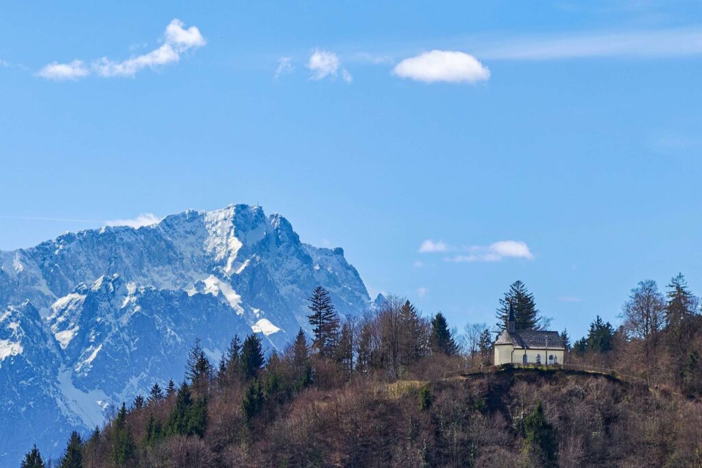 Die Zugspitze und Nikolauskapelle auf dem Vestbichl in Eschenlohe sieht man leider nicht immer so schön.